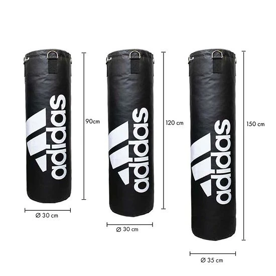 Der Adidas Boxsack „Klassik“ besteht aus robustem Polyurethan-Kunstleder. Dank der extrastarken Nähte hält der langlebige Boxsack auch harten Schlägen und Tritten sicher stand. Die geschredderten Textilreste sorgen zudem für eine gleichmäßige Füllung und bestmögliche Dämpfung. Im Vergleich zu Stahlketten sind die robusten Nylonstraps deutlich leiser, was vor allem in Fitnessstudios mit vielen Trainierenden den Lärmpegel merklich senkt. Die 4-Punkt-Aufhängung sorgt für einen konstanten Bewegungsradius des Boxsacks, während die in den Straps eingearbeiteten Metallösen einen stabilen Halt gewährleisten. Klicken Sie die Ösen einfach in den Karabiner Ihrer Deckenhalterung und schon kann das Training beginnen.