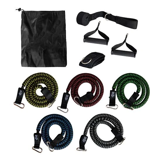 Die Sport-Thieme Tubes „Premium-Set“ erhalten Sie in verschiedenen Ausführungen für individuelles Widerstandstraining nach Leistungsstand. Jedes Set ist mit Handgriffen, Türanker, Fußschlaufe und Tasche zur praktischen Aufbewahrung ausgestattet. Die Widerstandsbänder sind aus LatexGebräuchliche Bezeichnung für Gummi. Latex ist der Milchsaft des Kautschukbaums und ein Bestandteil von Gummi. Er wird nach dem Trocknen als Kautschuk bezeichnet. gefertigt und mit einem Nylonüberzug versehen. An den Enden befinden sich Karabinerhaken, die das Einhängen von dem im Lieferumfang enthaltenen Zubehör ermöglichen. Das Sport-Thieme Tubes „Premium-Set“ sorgt aufgrund unterschiedlicher Widerstandsstufen für neue Trainingsanreize bei Einsteigern und Fitness-Profis – ob für Übungen sitzend oder stehend, Bizepscurls, Seitheben, Trizepsdrücken, Beinheben oder Rudern im Sitzen.